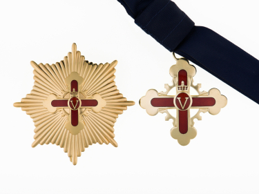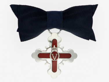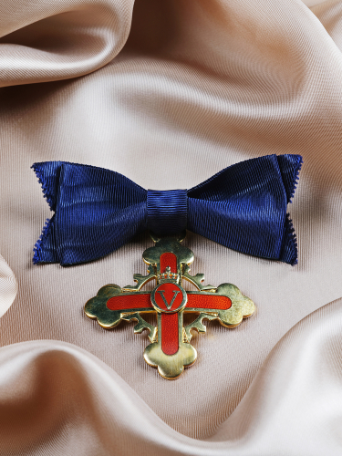 The Knight’s Cross is worn on the left breast, and the Commander’s Cross is suspended from a ribbon around the neck. The Grand Cross is attached to a broad sash worn passing from the right shoulder to the left side. Women wear the Knight’s Cross and Commander’s Cross on the left breast attached to a bow made from the Knight’s Cross ribbon.