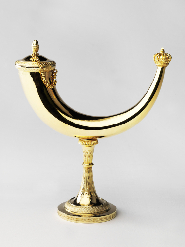 Made of gilt silver, the Anointment Horn is fashioned in the Empire style with a simple design and refined, sparse ornamentation. The handle of the horn’s lid is shaped like an acorn, and a small royal crown decorates the tip.