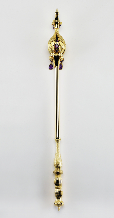 The Queen's Sceptre is made of gilt silver. More ornate than the King’s Sceptre, it has small amethysts and a sapphire inlaid in the handle. The top of the sceptre consists of four leaves that surround a core decorated with amethysts. Eight more amethysts hang down from the top.