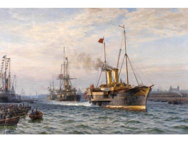 The work was painted by the Danish maritime painter Vilhelm Arnesen (1865-1948), who is often referred to as the last in a line of important maritime painters in Denmark. As a young man Arnesen was invited to sail with the Royal Danish Navy on several occasions. In 1895 he was introduced to Prince Carl, who was then a naval officer on board the corvette Dagmar. The two became friends and Arnesen was later invited to go sailing with the Prince. He was also in the Kings retinue when the Dannebrog sailed from Copenhagen on 23 November 1905. As in many of Arnesens earlier maritime paintings, the motif and depiction of events are naturalistic and full of life.