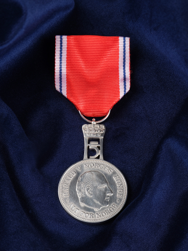 The medal is conferred in silver and bears a crown. On the obverse is the likeness of the head of the reigning Monarch in profile with his name and motto. On the reverse is the Cross of St. Olav. The monogram of the reigning King is placed over the medal. An oak leave cluster adorns medals bestowed for service during wartime.