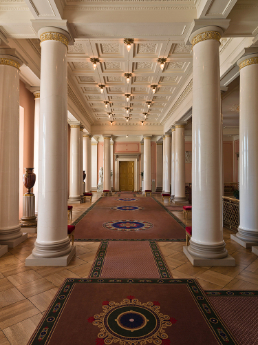 Øvre vestibylena birastahttet 20 stukkmarmor stoalppu. Álggos lei jurdda čuollat stoalppuid vilges bergen marmoras. Stuoradiggi juolludii dien bargui ruđa 1836:s, ja marmorčuollan álggahuvvui. Muhto muhtun iežas olgoritmátkkiin jagiin 1836-37 bođii almmatge Linstow dan oaivilii ahte stukkmarmor dáiddii lean miha vuohkkasit ávnnas, danin go de lei álkit válljet ivnniid. Son evttohii vuosttaš geardde 1839:s ahte eai go sáhtáše stoalppuid ráhkadit stukkmarmoris, ja evttohii dan seamma fas ođđasis 1840:s ja 1842:s. 1843 čavčča guorrasii Šloahttakommišuvdna su árvalussii.