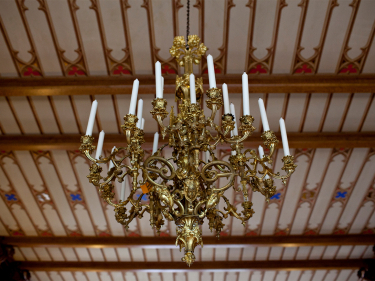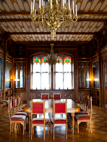 The Dining Hall features four multi-coloured lead glass windows, arranged in pairs and surrounded by a flattened Tudor arch. The windows in the end walls are the same as those in the Drawing Room and have red, orange, ochre and green glass in the upper section. Mirrors are set into all the walls to make the room appear even larger than it is. The walls are covered with carved panelling and moulded oak pilasters with consoles in the shape of swans at the top. The swan consoles support the beams that run across the ceiling. Between the beams the ceiling is decorated with simple Neo-Gothic ornaments in red, blue and gold on a white background.