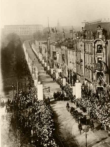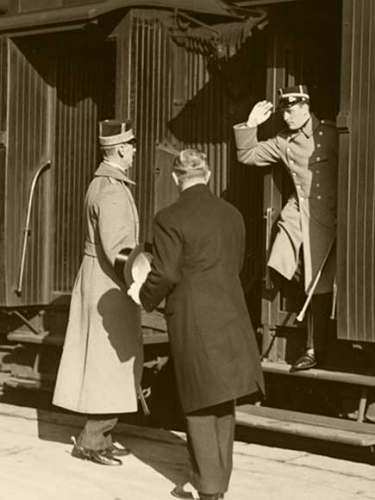 Princess Märtha arrived in Oslo by train several days before the wedding. During the last part of the journey, the princess rode in her own special train decorated with flags and the couples initials. She was met at Oslo Eastern Railway Station by Crown Prince Olav. The bride-and-groom-to-be rode in a landau drawn by four horses up Karl Johans gate to the Royal Palace, where they greeted their many well-wishers from the Palace balcony.