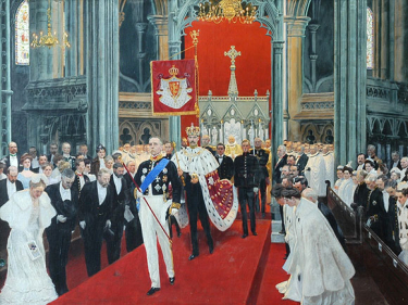 King Haakon, attired in the coronation robe, stepped forward and knelt before the high altar. Bishop Wexelsen anointed the King’s forehead and wrists. The King then seated himself on the coronation throne that was positioned in front of the high altar, and Prime Minister Christian Michelsen and Bishop Wexelsen together placed the crown on the King’s head. Minister of Foreign Affairs Jørgen Løvland then presented the King with the royal sceptre, while Minister of Trade Sofus Arctander presented the royal orb. The sword of state was presented by Minister of Defence Wilhelm Olssøn. Bishop Wexelsen said a prayer for the King’s solemn duties and offered a blessing. The King then returned to the coronation throne under the canopy, wearing the coronation robe and bearing the royal regalia.
