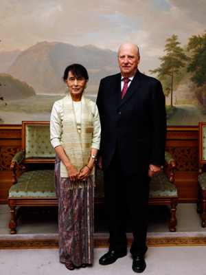 June16 June: The King grants Nobel Laureate Aung San Suu Kyi audience. Queen Sonja and Crown Prince Haakon are also in attendance (Photo: Lise Åserud / NTB scanpix) -