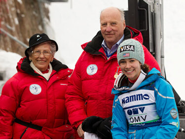 March9 - 10 March: King Harald and Princess Astrid, Mrs Ferner attend the Nordic World Cup in Holmenkollen. Here congratulating American Sarah Hendrickson with her gold medal (Photo: Terje Bendiksby / Scanpix) -