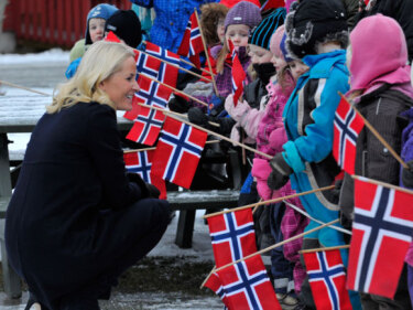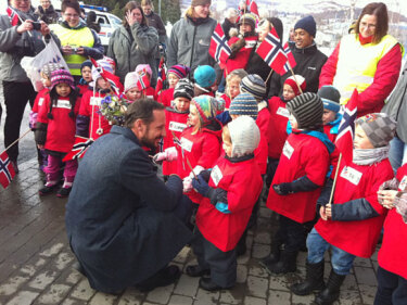 Nord-Trøndelag17 February: Crown Princess Mette-Marit visits the Nord-Trøndelag County and is met by children from a local kindergarten in Levanger (Photo: Ned Alley / Scanpix) -