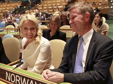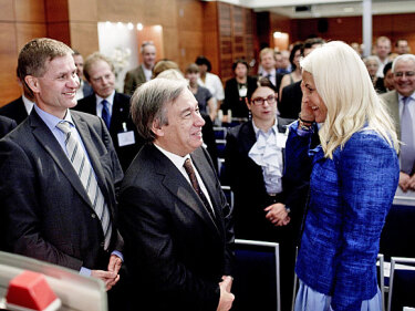 The Nansen Conference6 June: Crown Princess Mette-Marit opens the Nansen Conference on Climate Change and Displacement in the 21st Century. Here with UN's António Guterres and Minister Erik Solheim (Photo: Scanpix) -