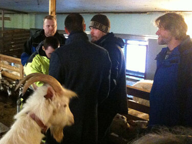 The Musketeers at Nordgård10 February: Crown Prince Haakon visits the goat shed together with "the Musketeers" at Nordgård fram (Photo: Liv Anette Luane Kristensen, The Royal Court) -