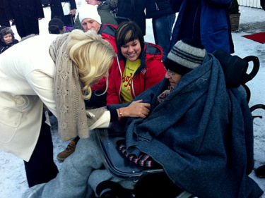 Joy of life18 February: Crown Princess Mette-Marit meets senior citizens gathered around the fire for coffee outside Lian Restaurant in Trondheim. They take part in the Joy of life project. (Photo: Christian Lagaard, The Royal Court) -