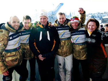 Day 9: RelayKing Harald and Queen Sonja with the Norwegian team, Tord Asle Gjerdalen (left) , Eldar Rønning, Petter Northug and Martin Johnsrud Sundby after their gold in the men's relay (Photo: Lise Åserud / Scanpix) -