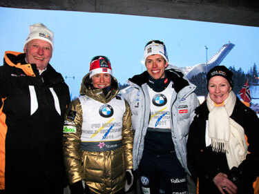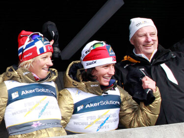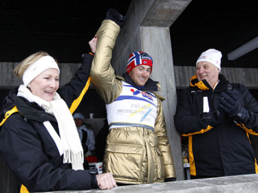 Day 3: 15 km cross country26 February: King Harald and Queen Sonja with world champion Marit Bjørgen after her victory on the 15 km cross country (Photo: Lise Åserud / Scanpix) -
