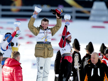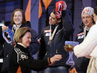 Day 11: Cross country 50 kmKing Harald presents prizes to Petter Northug and the other medalists after the 50 km (Photo: Gorm Kallestad / Scanpix)