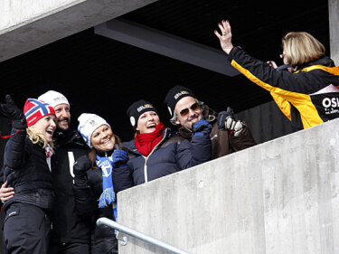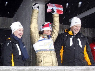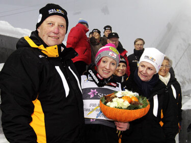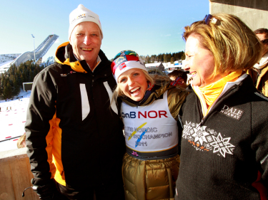 Day 5: Cross country 10 kmKing Harald and Queen Sonja could once again welcome Marit Bjørgen on the Royal stands after her victory on the 10 km cross country (Photo: Gorm Kallestad / Scanpix) -