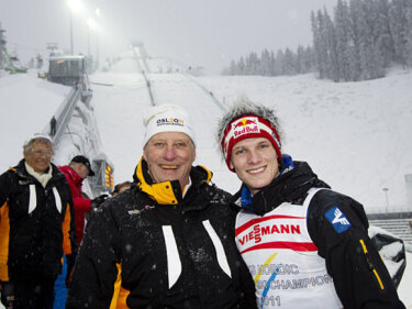 Day 3: Ski jumpingAustria's Thomas Morgenstern is contratulated by King Harald with his world championship in ski jumping, normal hill (Photo: Kyrre Lien / Scanpix) -
