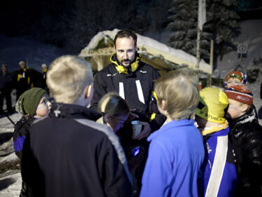 Day 4: Ski jumping teamsKing Harald attends the ski jumping for teams, normal hill. The Austrian team wins the gold, and ask the King for his autograph (Photo: Stian Lysberg Solum / Scanpix) -