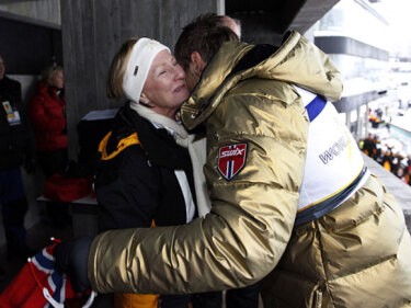 Day 4: Cross country 30 kmQueen Sonja gives Petter Northug a hug after his victory on 30 km cross country (Photo: Lise Åserud / Scanpix) -
