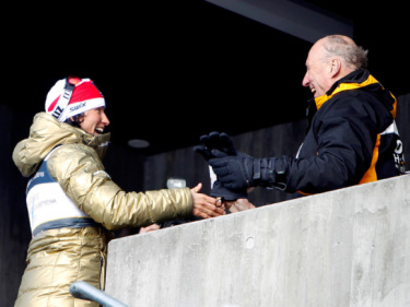 Day 4: Cross country 30 kmWorld champion Petter Northug on the Royal stands with King Harald and Queen Sonja (Photo: Lise Åserud / Scanpix) -
