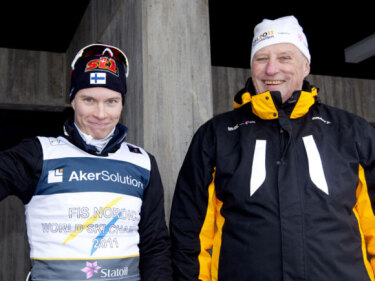 Day 6: Cross country 15 kmThe winner of the 15 km for men, Finland's Matti Heikkinen, with King Harald at the Royal stands after the flower ceremony (Photo: Kyrre Lien / Scanpix) -
