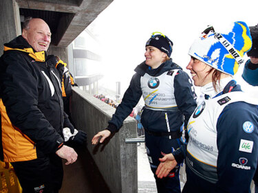 Day 7: Team sprintCharlotte Kalla and Ida Ingemarsdotter from Sweden meet King Harald after winning the women's team sprint (Photo: Lise Åserud / Scanpix) -