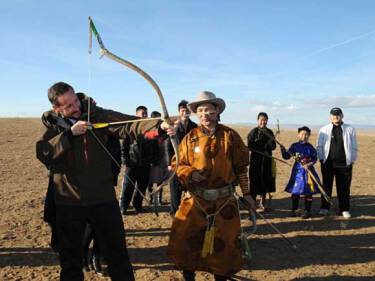 ArcheryCrown Prince Haakon tested his archery skills supported by herder Gantuya (Photo: D. Rentsendorj, Montsame news agency). -