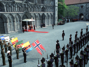 His Majesty The King's Guard greets the King and Queen outside Nidaros cathedral (Photo: Gorm Kallestad NTB / Scanpix)