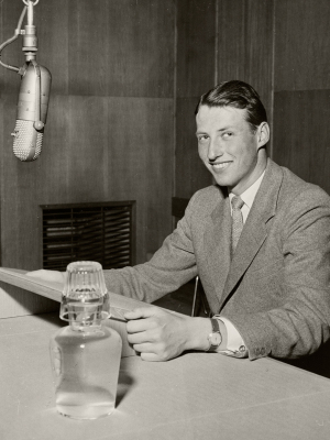 Prins Harald i NRK-studio, leser inn hilsen til Kong Haakons 85-årsdag, 1957. Foto: NTB, De kongelige samlinger