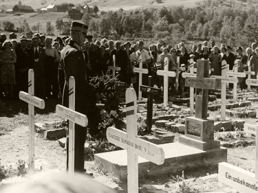 GjenreisningKong Haakon besøkte krigskirkegården i Harstad under reisen i Finnmark. Fotograf ukjent, De kongelige samlinger. -
