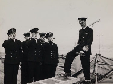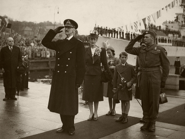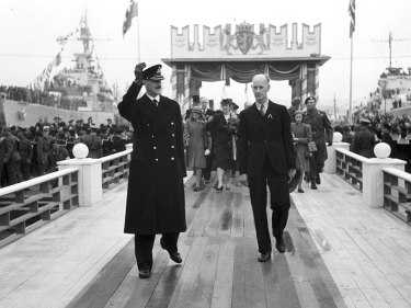 HjemkomstDen 5. juni 1945 gikk Kong Haakon om bord i HMS Norfolk i Edinburgh til lyden av «Ja vi elsker». Det var starten på reisen hjem til Norge. Foto: Royal Navy Official Photograph (UK) -