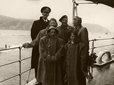 HjemkomstKongefamilien på dekk. HMS Norfolk har ankommet Oslofjorden på vei hjem til et fritt Norge. Foto: the Royal Navy -