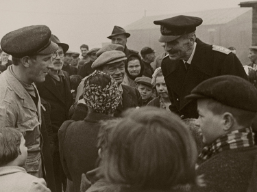 GjenreisningKong Haakon ønskes velkommen på havna i Honningsvåg. Fotograf ukjent, De kongelige samlinger.
