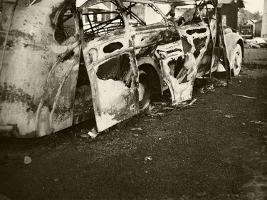 NybergsundRegjeringens buss bombet i stykker ved Nybergsund 11. april 1940. Foto: Johan Wilhelm Clüver, De kongelige samlinger -