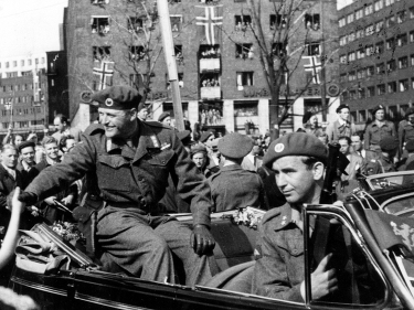 Homecoming13 May 1945, Crown Prince Olav returnes to Norway. Max Manus of the Norwegian resistance acts as the Crown Prince's bodyguard (NTB / Scanpix) -