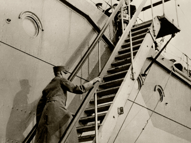 Leaving NorwayIt became evident that Norway, even with the support of our allies, was unable to withstand the German forces. King Haakon had to make the difficult decision of leaving the country. On June 7 1940, King Haakon and Crown Prince Olav boarded the British cruiser <i>Devonshire</i> (Photo: The Royal Court Photo Archives) -