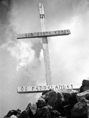 Viktige symbolPå den 1728 meter høye fjelltoppen Skogshorn i Hemsedal satte norske ungdommer opp Kong Haakons merke. Foto: NTB scanpix -