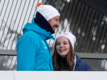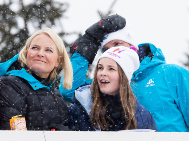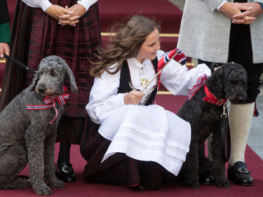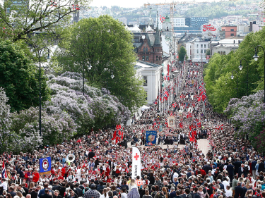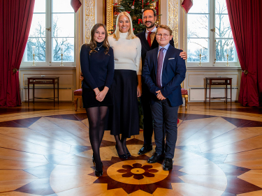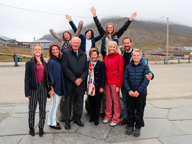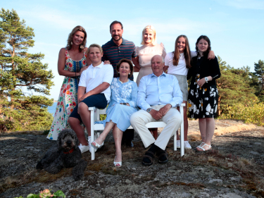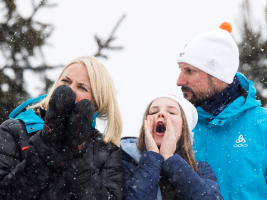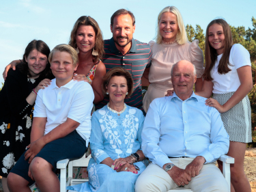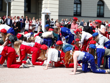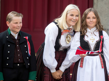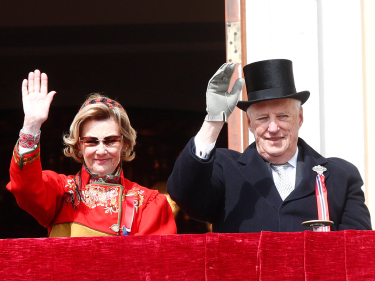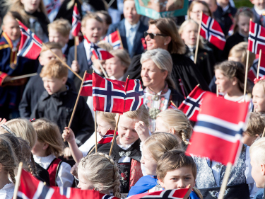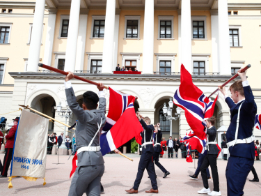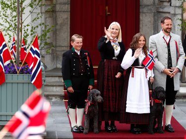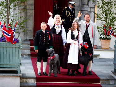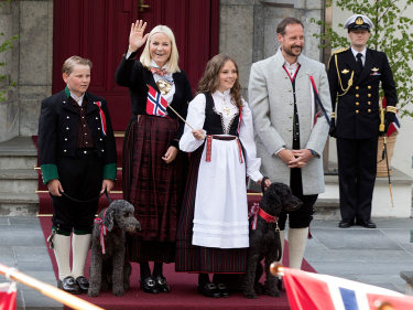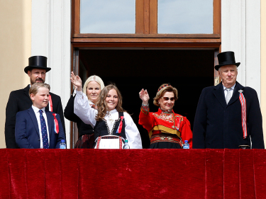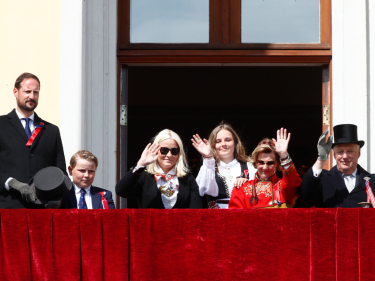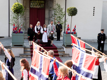Gratulerer med dagen! Tradisjonen tro hilste Kongefamilien barnetoget i Oslo fra Slottsbalkogen 17. mai. Tradisjonen ble instiftet av Kong Haakon i 1906 - bare avbrutt av krigsårene. For Kronprinsfamilien startet dagen i Asker, der de tok i mot barnetoget der utenfor Skaugum.