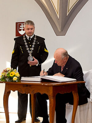 GuestbookThe Mayor of Banská Štiavnica, Pavol Balžanka looks on as King Harald signs the Town Hall guestbook (Photo: Terje Bendiksby / Scanpix) -
