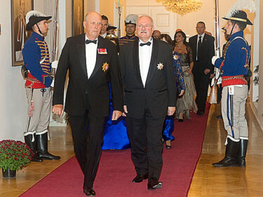 Gala DinnerKing Harald and President Gašparovič arrive at the gala banquet in the former parliament building (Photo: Terje Bendiksby / Scanpix) -