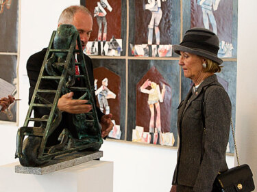 DanubianaMuseum Director Vincent Polakovič gave Queen Sonja a guided tour of the exhibition at Danubiana Meulensteen Art Centre (Photo: Terje Bendiksby / Scanpix) -
