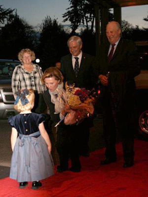 Arrival4 year old Bergen Gandrud Pickett had flowers for Queen Sonja when The King and Queen arrived at their hotel (Photo: Urd Berge Milbury) -