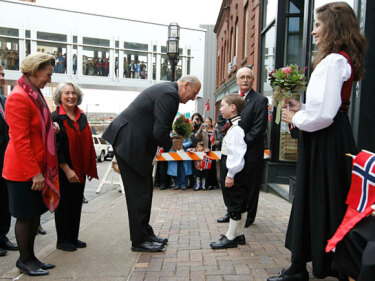 Norway HallThe King and Queen arrive at Norway Hall in Duluth. King Harald is given flowers by Atle Anders Faith Rennan (Photo: Lise Åserud / Scanpix) -