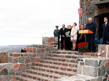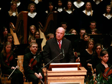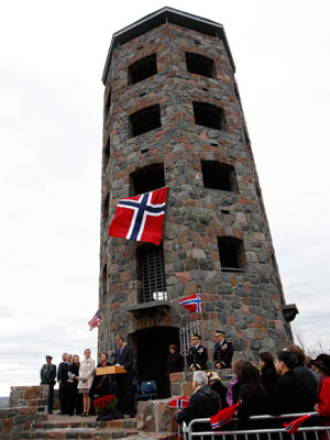 Enger TowerKing Harald speeks at the rededication of Enger Tower (Photo: Lise Åserud / Scanpix) -