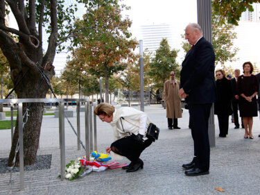 Ground ZeroFrom L to R: Crown Princess Mary, Crown Prince Frederik, President Tarja Halonen, King Carl Gustaf, Queen Silvia, Queen Sonja, King Harald, Dorrit Moussaieff and President Ólafur Ragnar Grímsson visit the 9/11 Memorial Site (Photo: Andrew Kelley / Reuters / Scanpix) -