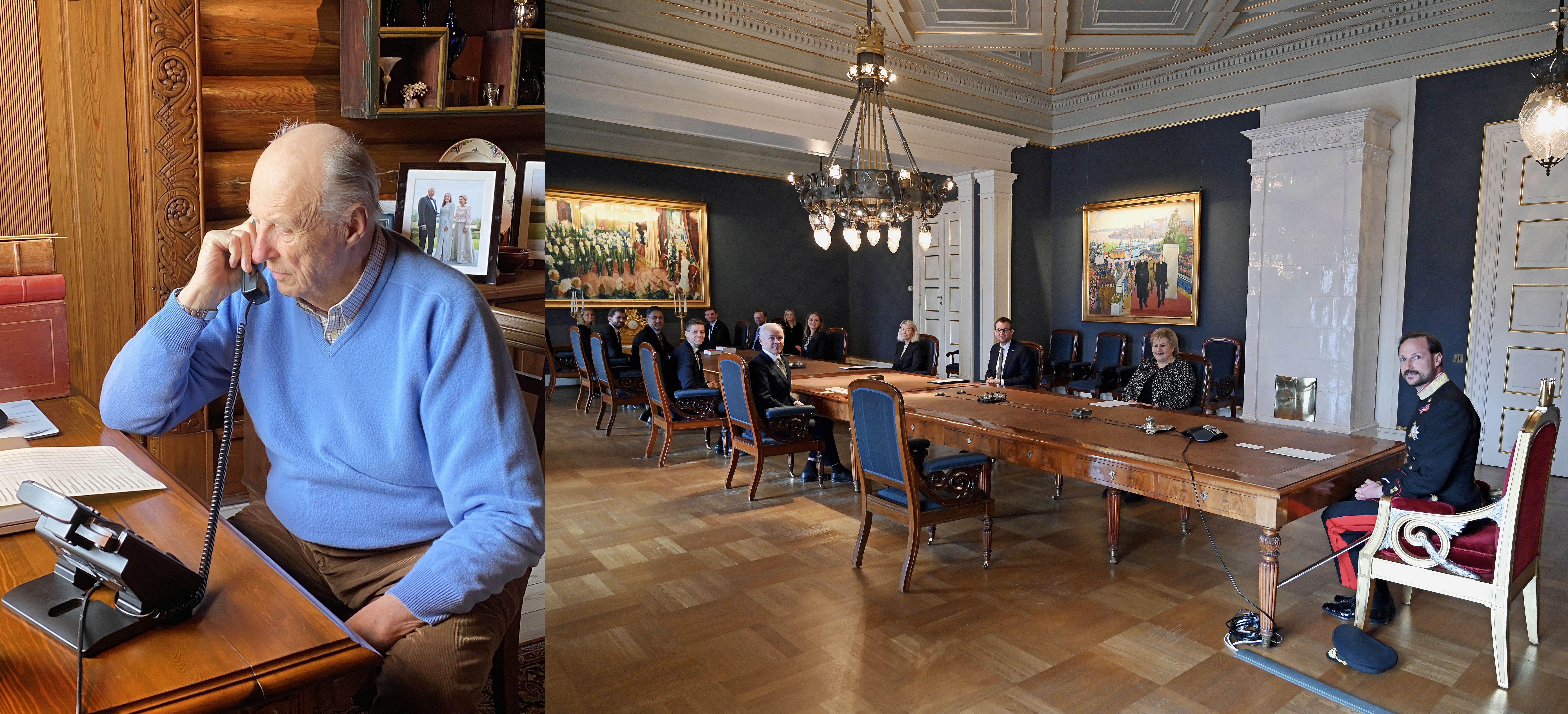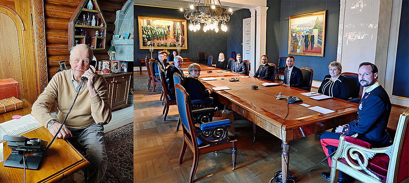 Fra 13. mars 2020 ledet Hans Majestet Kongen Statsråd over telefon fra Kongsseteren mens han var i karantene etter sitt statsbesøk til Jordan. Dette albumet inneholder bilder fra perioden 13. mars til 7. mai.