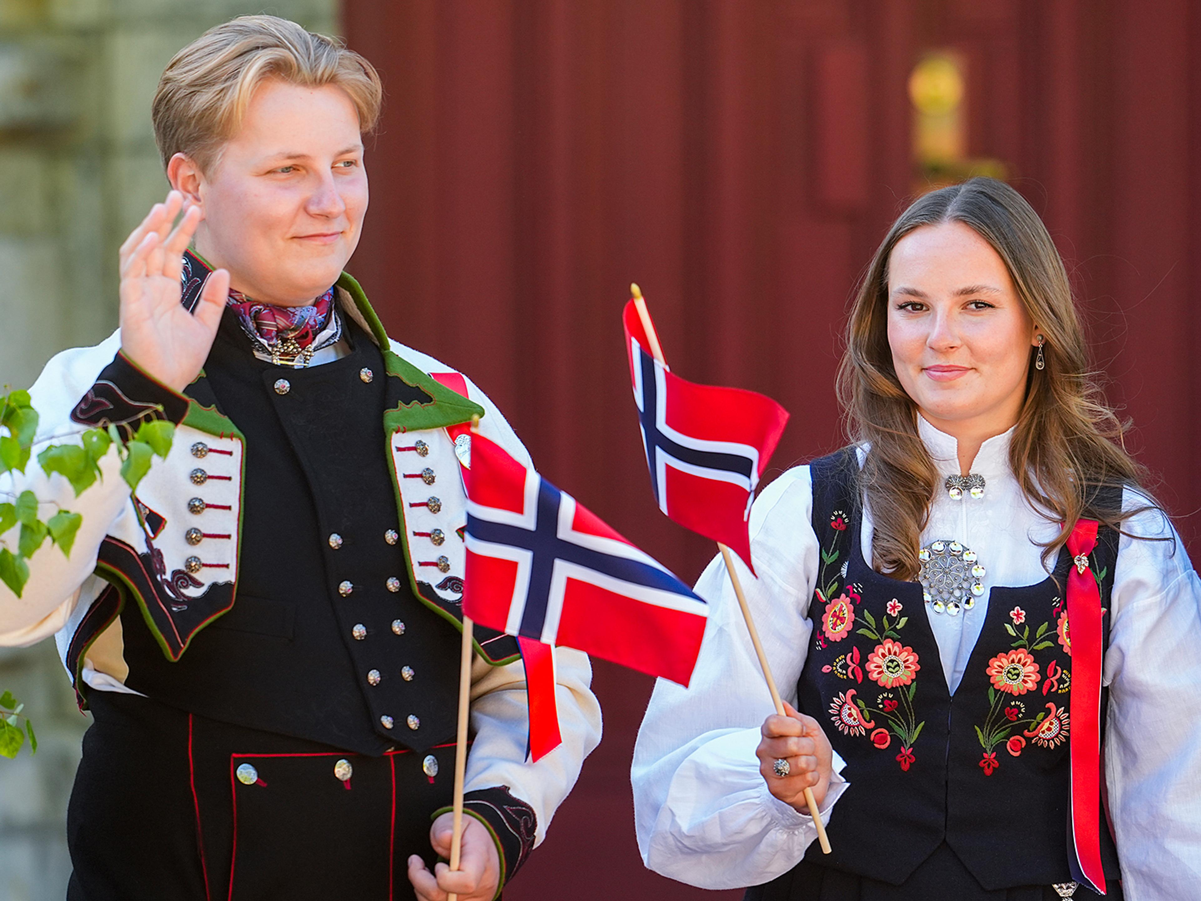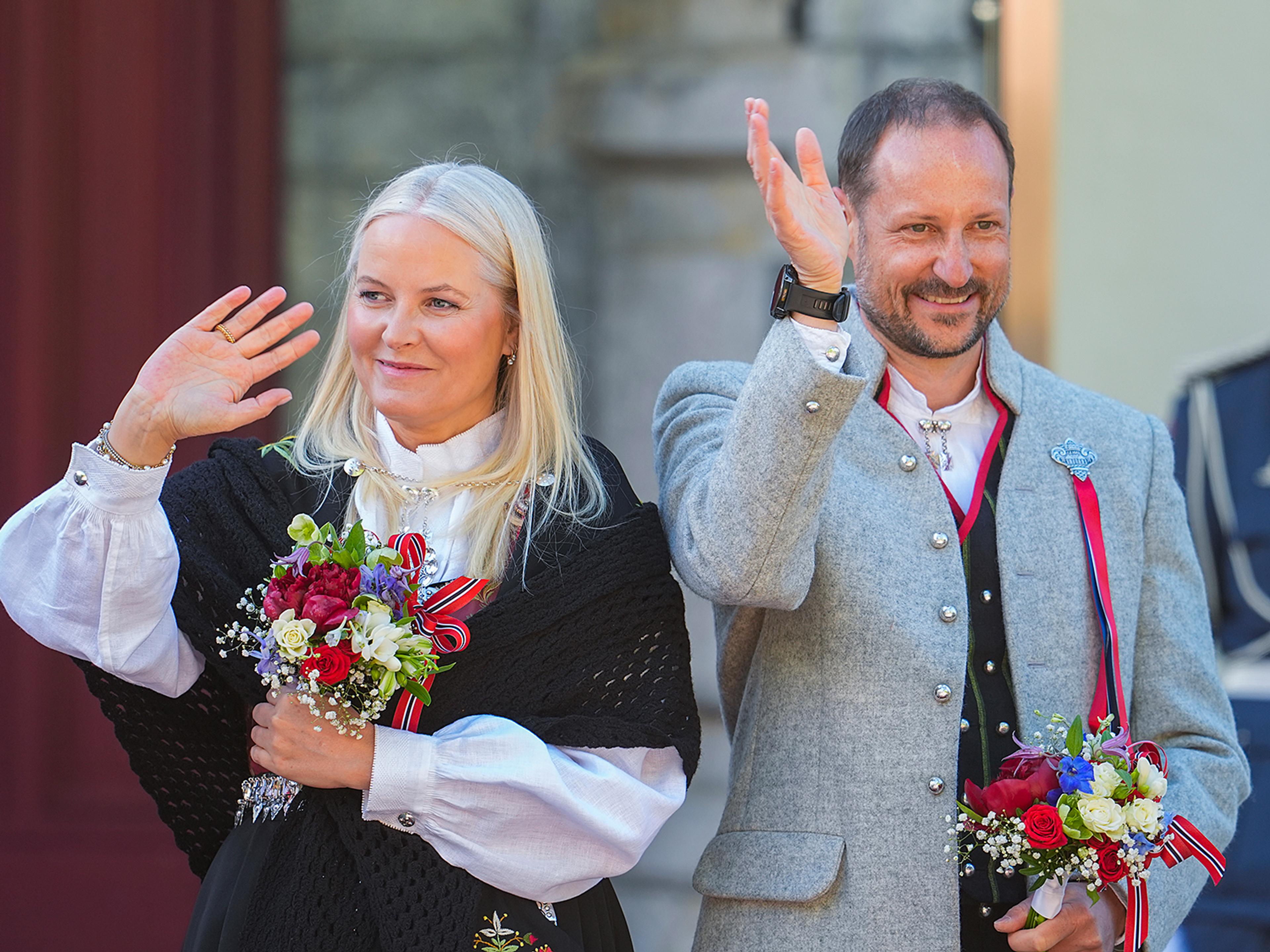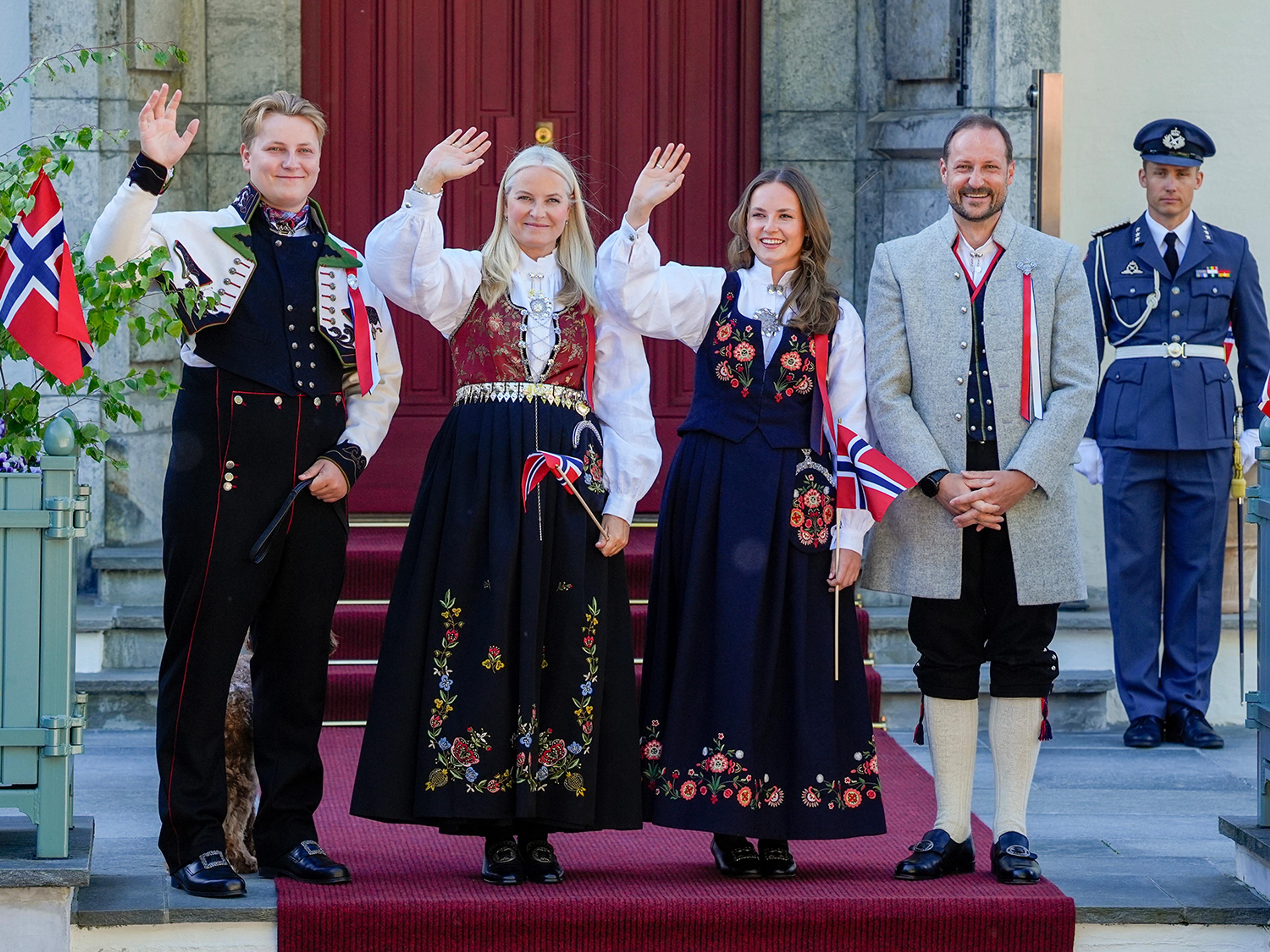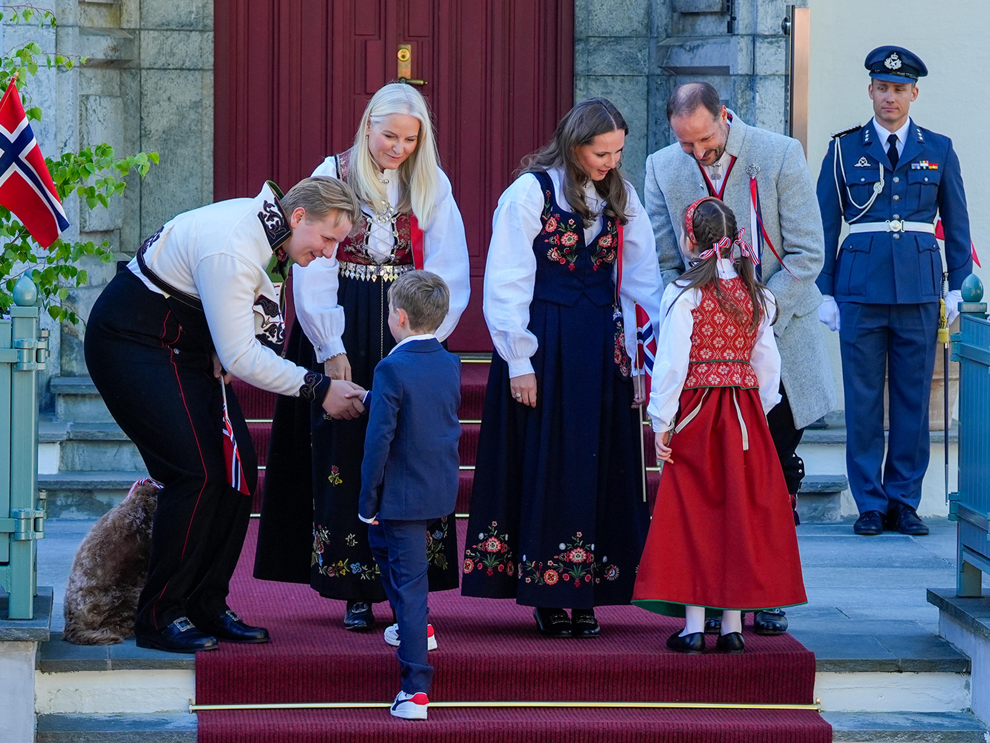 For the Crown Prince and Crown Princess the day's programme began at Skaugum early this morning, when the children's parade in Asker reached Skaugum estate. There the children were greeted by Crown Prince Haakon, Crown Princess Mette-Marit, Princess Ingrid Alexandra and Prince Sverre Magnus.