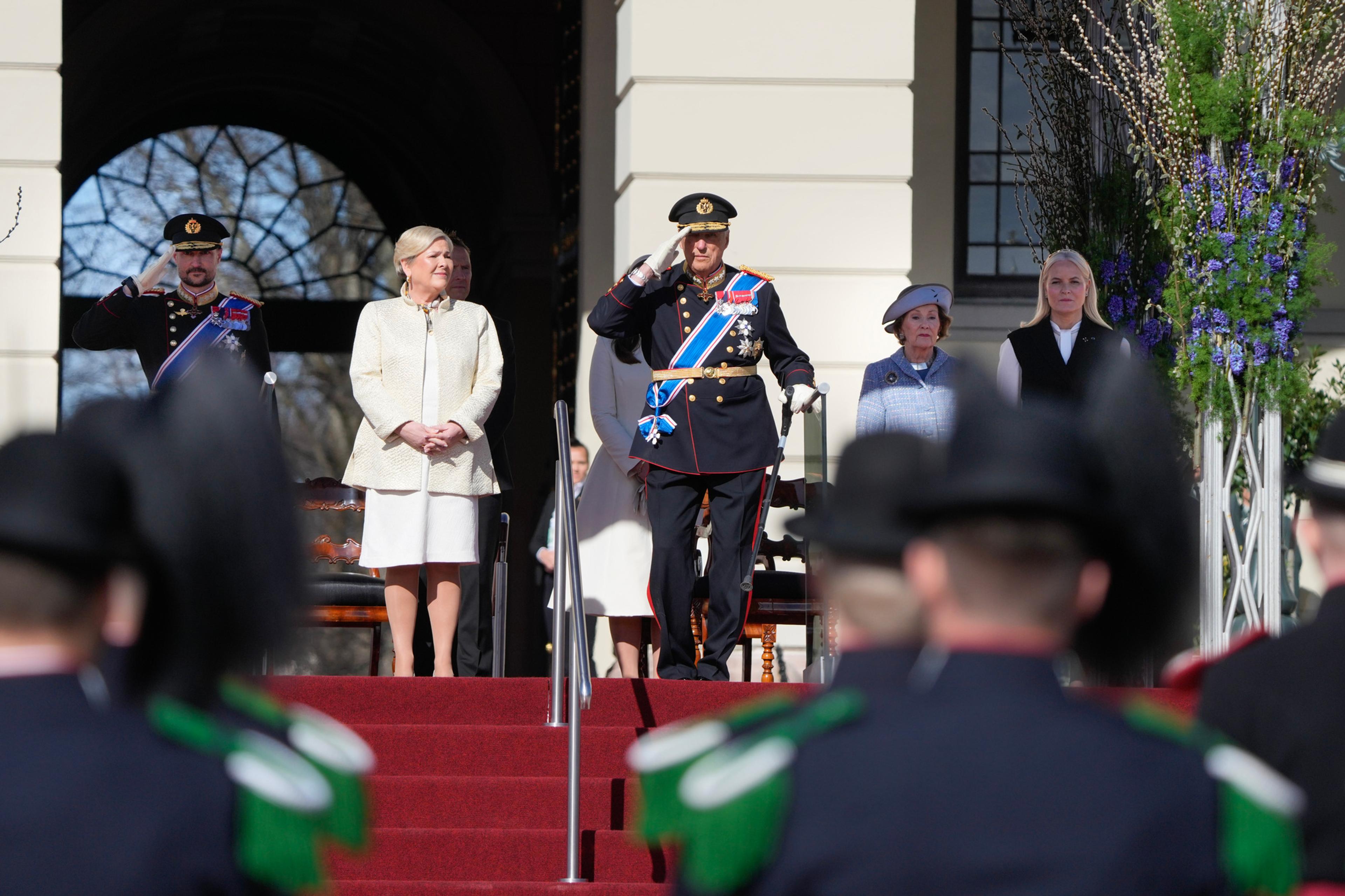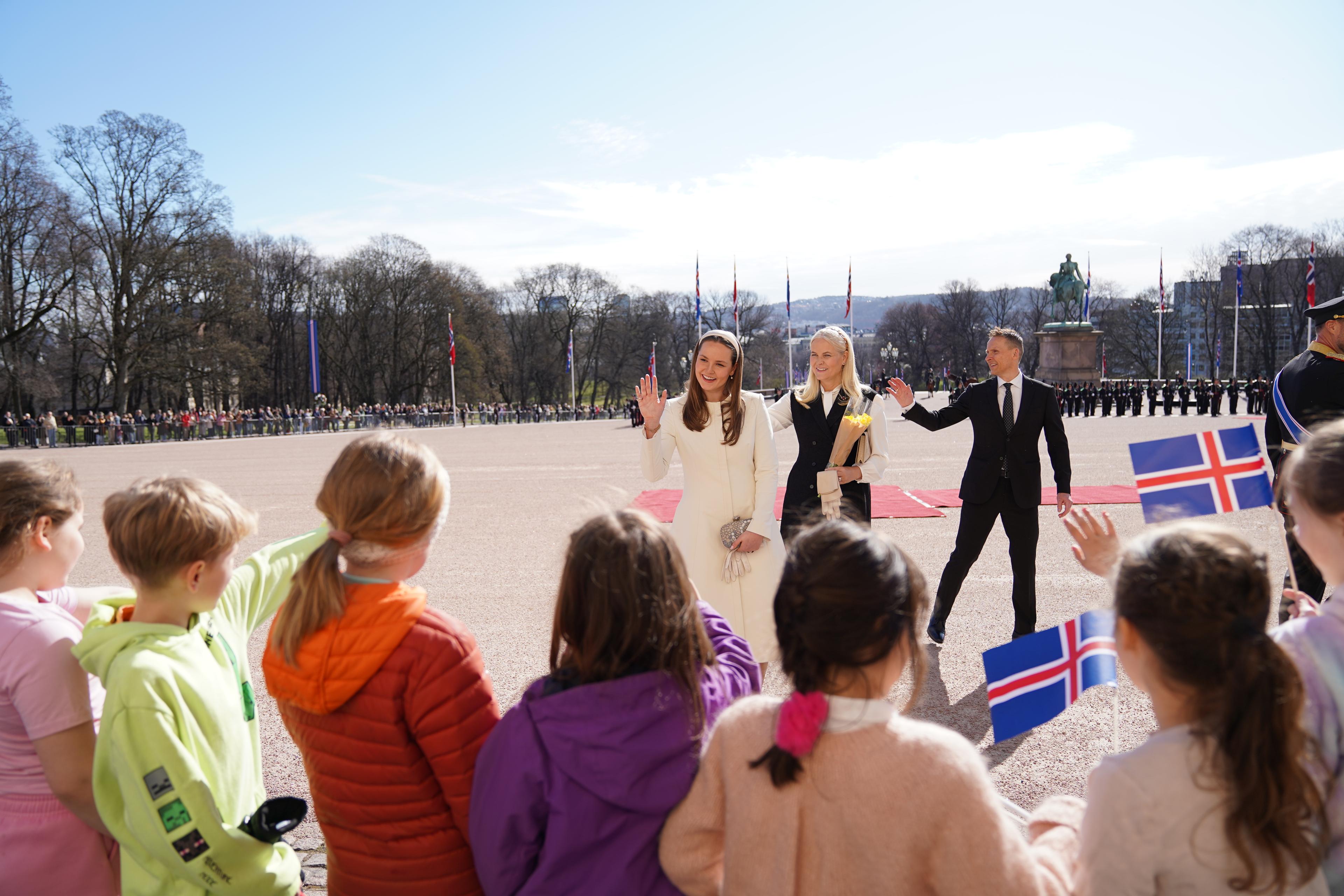 The formal welcome ceremony began at the Palace Square, where the national anthems of both countries were played, and President Tómasdóttir, accompanied by His Royal Highness Crown Prince Haakon, inspected an honour guard from the King's Guard.