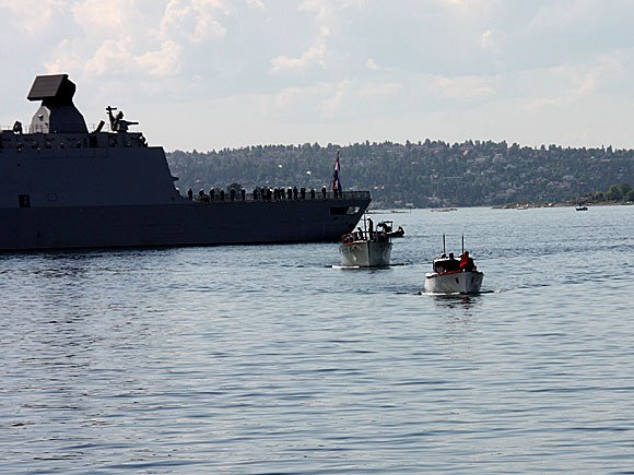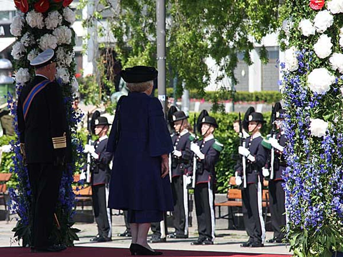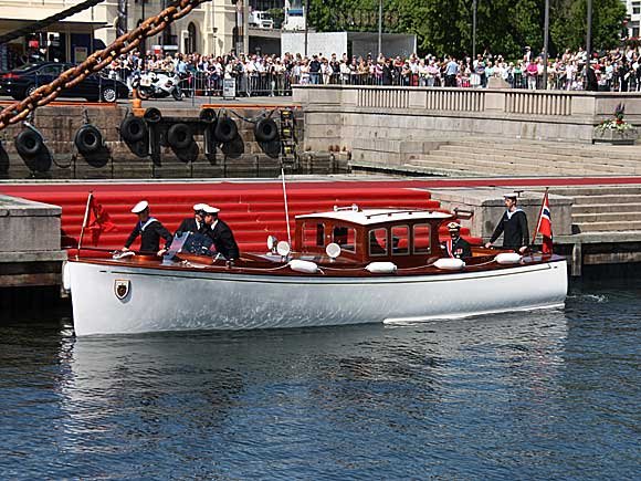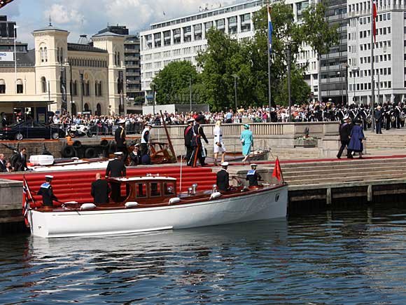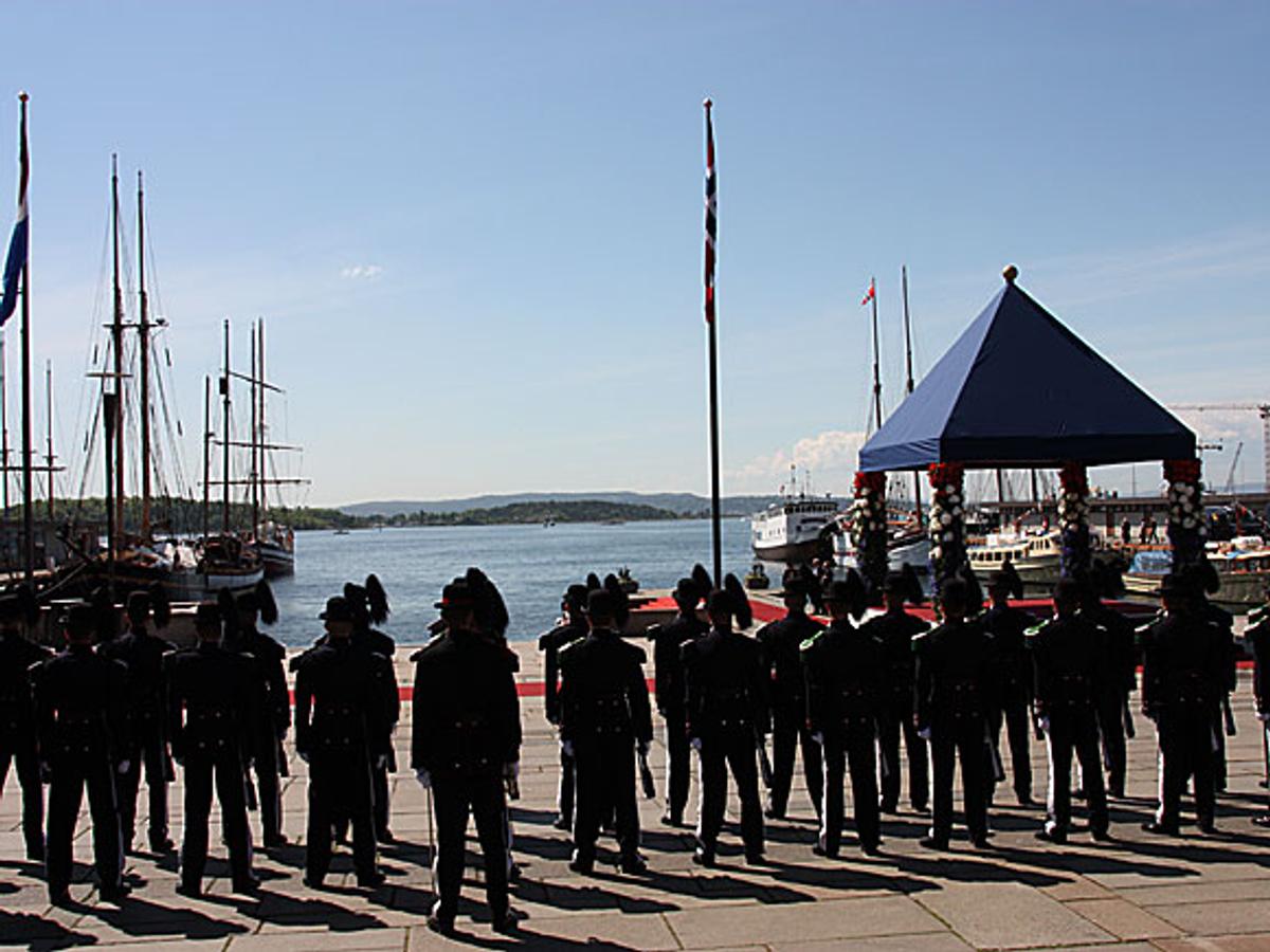 Queen Beatrix arrived at the Port of Oslo on board the Dutch frigate Tromp. His Royal Highness Crown Prince Haakon met the frigate with the Royal Barge Stjernen and accompanied the Queen to the Honnørbrygga dock near Oslo City Hall, where she was received by King Harald, Queen Sonja and Crown Princess Mette-Marit.
