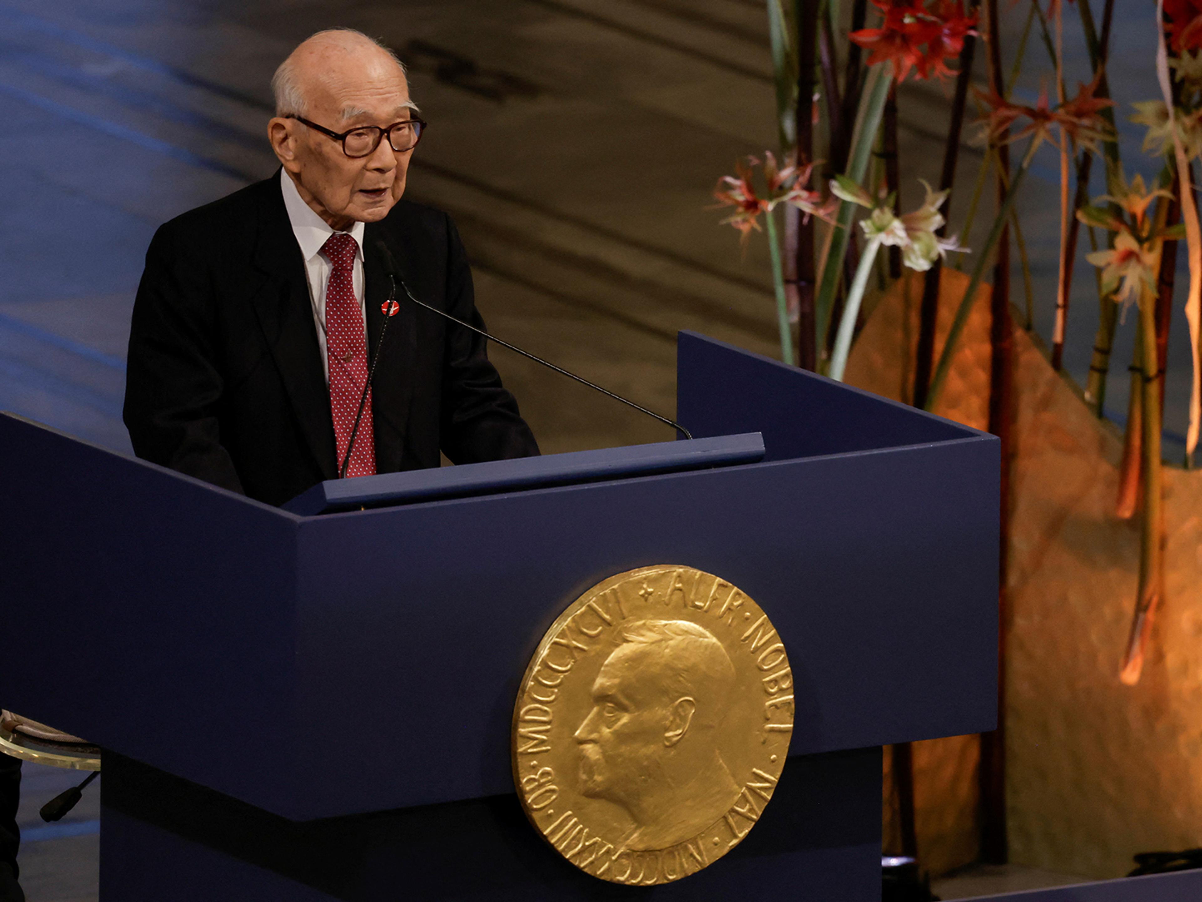 Terumi Tanaka delivered Nihon Hidankyo’s Nobel lecture, in which he described, among other things, the horrific consequences of the atomic bombings of Hiroshima and Nagasaki.