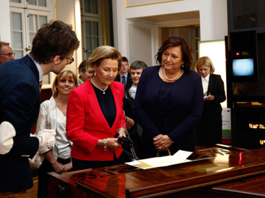 Today Queen Sonja visited the Fryderyk Chopin Museum in Warsaw to view the largest collection of Chopin-related material in the world. The collection includes original music manuscripts, correspondence and personal belongings, as well as reviews and other documents that give insight into how Chopin’s contemporaries experienced him and his music. The museum has built a modern, interactive collection, and also organises concerts and competitions of Chopin’s music.